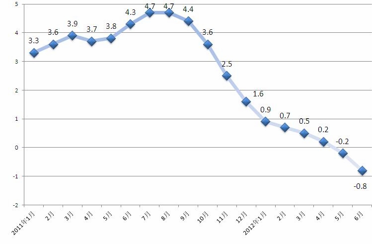 2011年1月-2012年6月PPI月度同比涨幅走势图